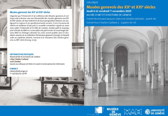 Les 6 et 7 novembre 2025, le Musée d’art et d’histoire de Genève accueille le colloque « Musées genevois aux XXe & XXIe siècles », deux journées de conférences et d’échanges destinées aux professionnels et professionnelles du secteur muséal, ouvertes à toute personne intéressée.